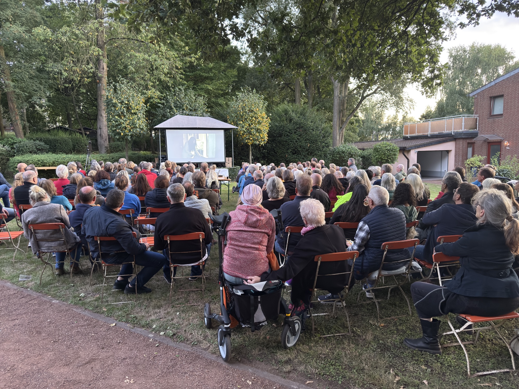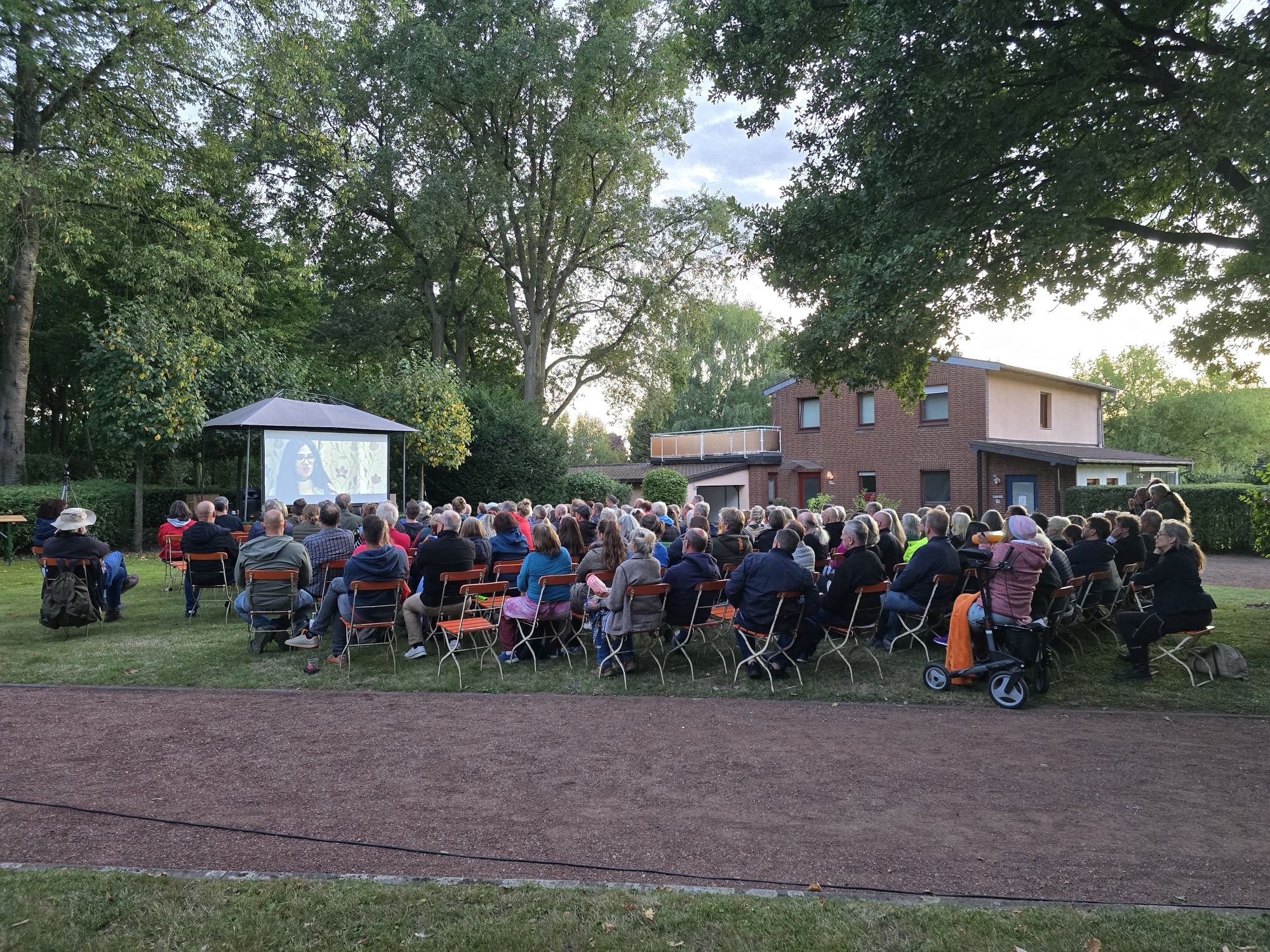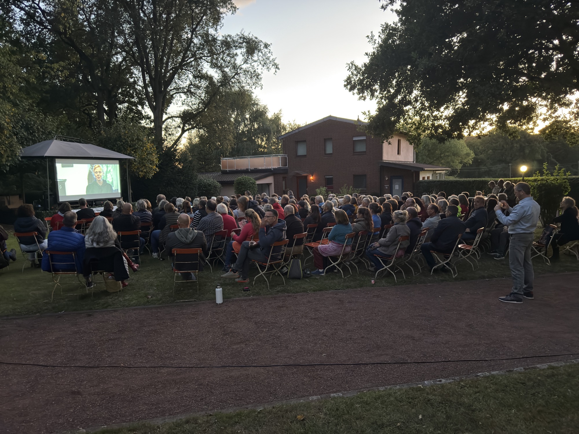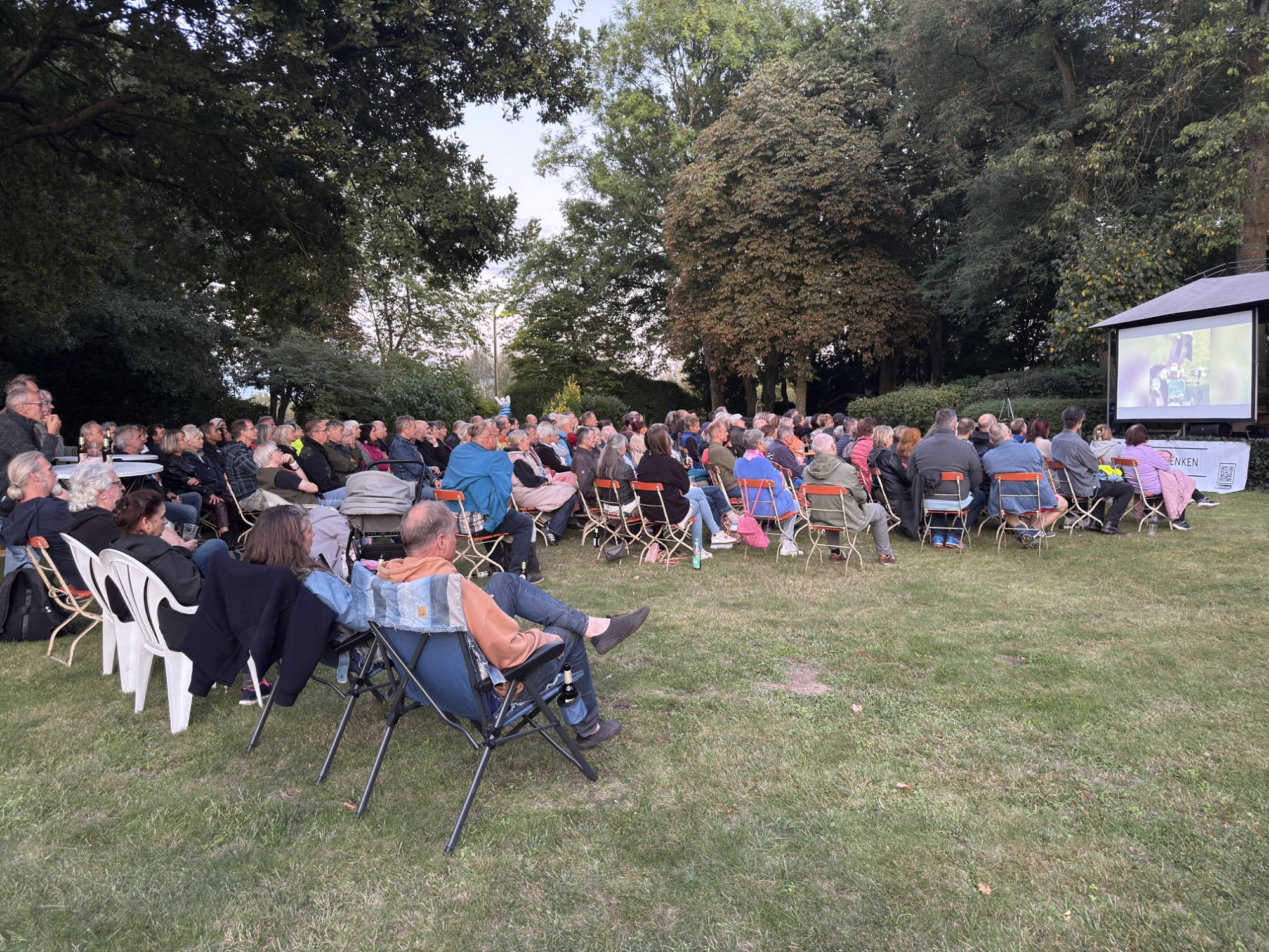 Bei schönem Wetter trafen sich Interessierte im Mühlenpark bei belegten Brötchen, Kaltgetränken und - wie es sich für eine Filmvorführung gehört - Popcorn zum gemütlich Beisammensein und ergiebigen Gesprächen. Zudem gab es nach der Filmvorführung noch eine ausgiebige Gesprächsrunde zwischen Publikum und dem Produzenten.